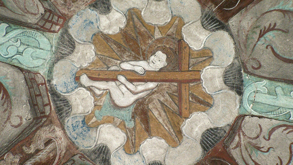 Jesusbarnet med korset i en stjärna (Betlehemsstjärnan). Målning av Albertus Pictor i Härkeberga kyrka. Foto: Per Bergström.